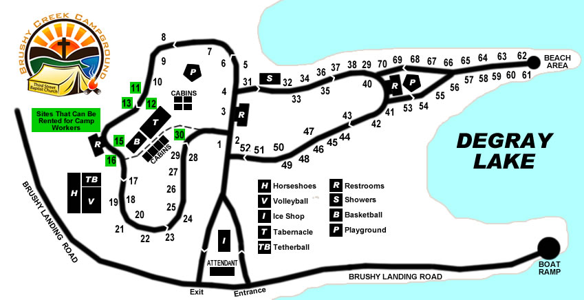 There are several recreational areas that can take advantage of. There is a full size basketball court, a sand volleyball court, 2 tetherball poles, horseshoes, playground area, and of course a beach area on beautiful DeGray Lake (the beach area is on the other side of the campground from the Tabernacle area and most people use vans to shuttle members back and forth). |